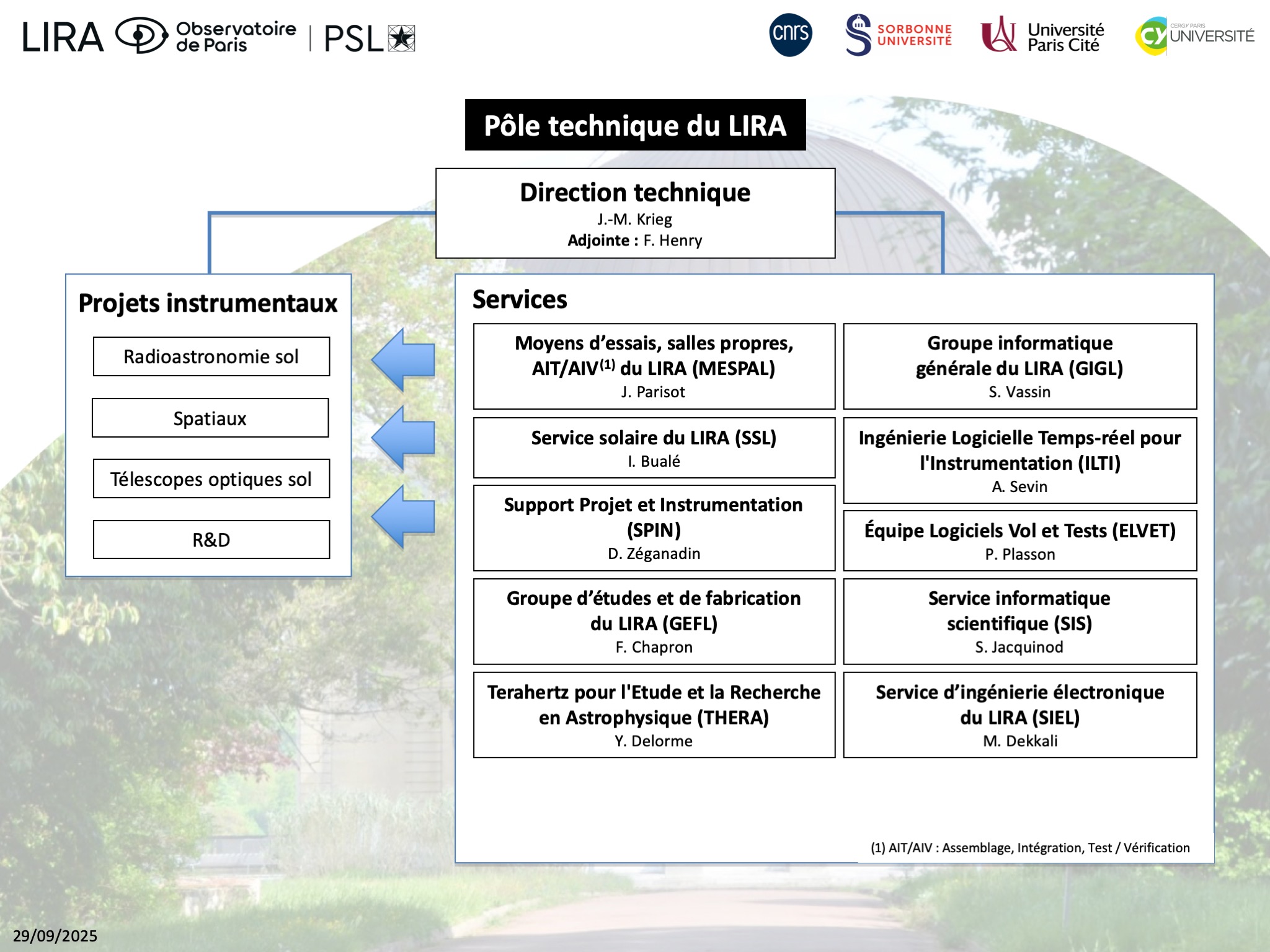 - SIS (Service Informatique Scientifique), assure le suivi et le traitement informatique des données produites par les instruments en exploitation du LIRA ;